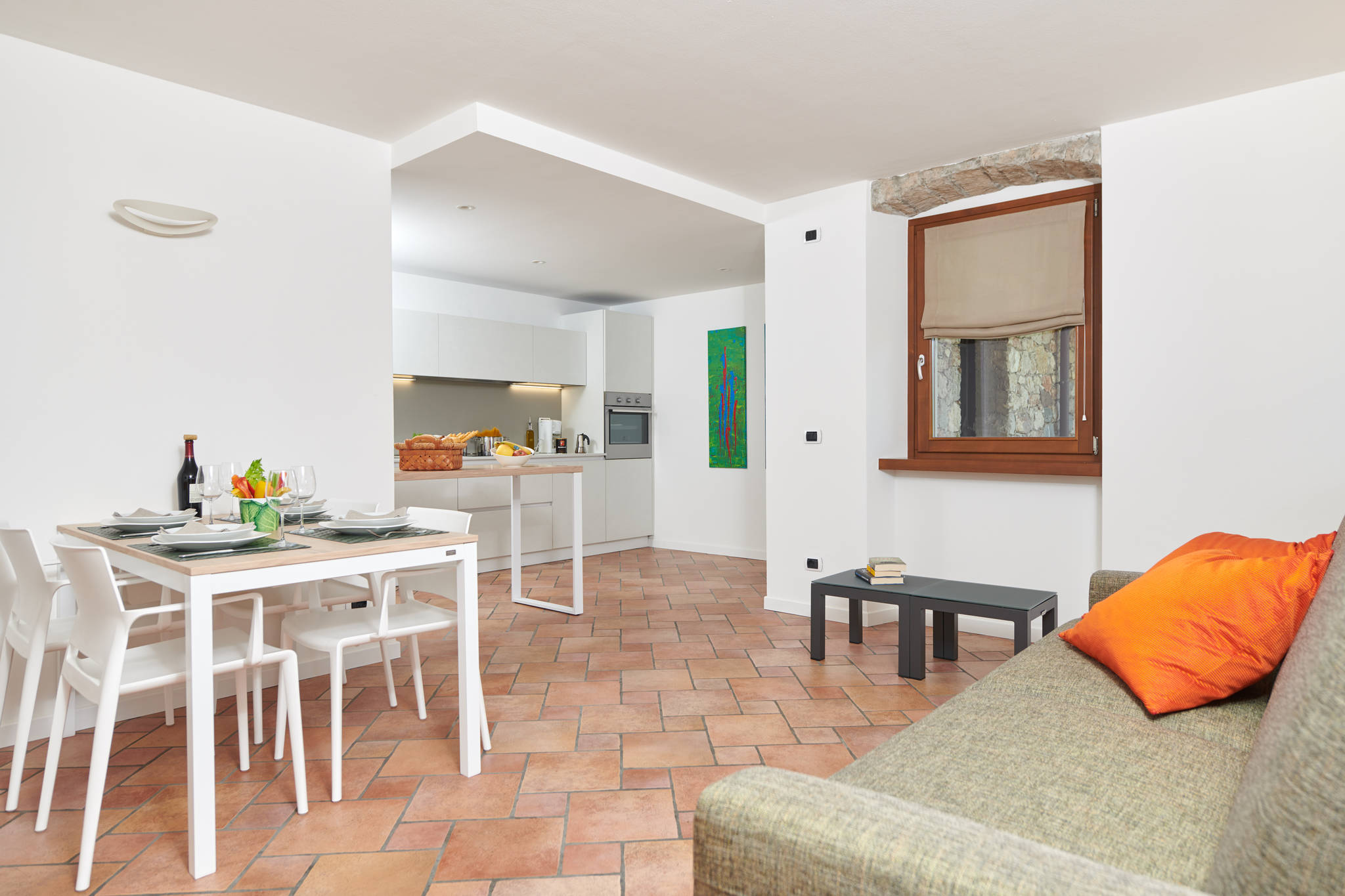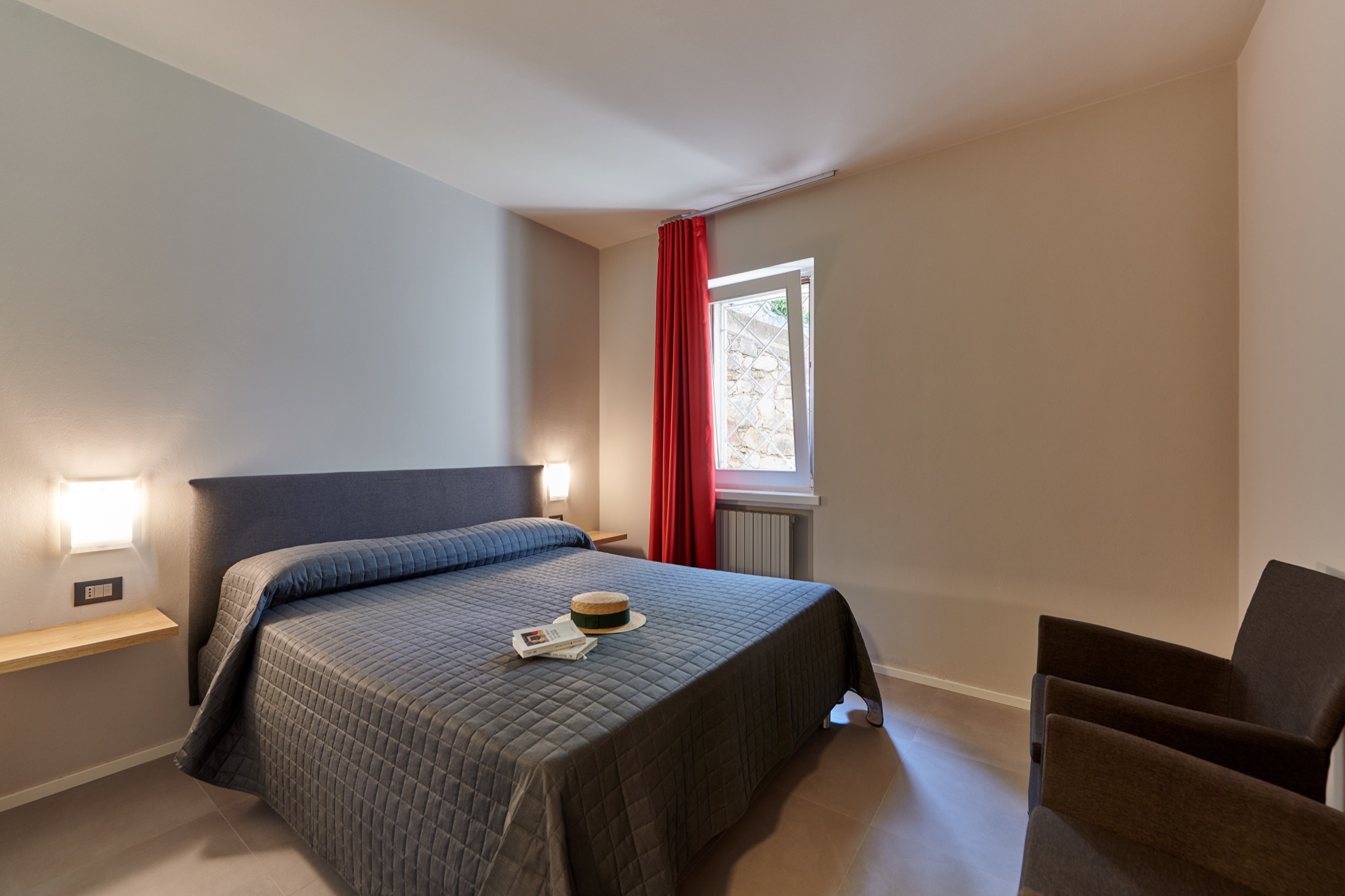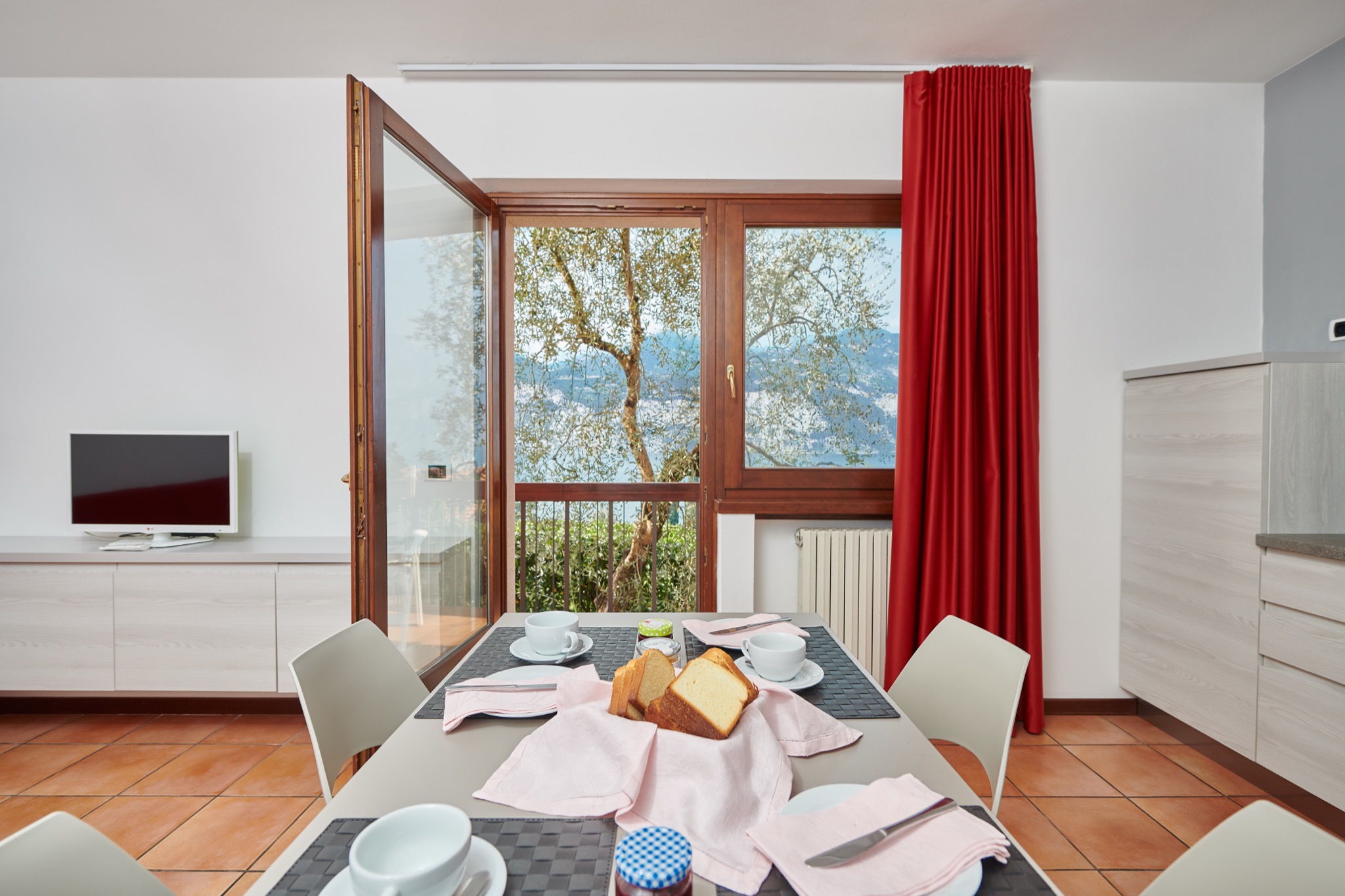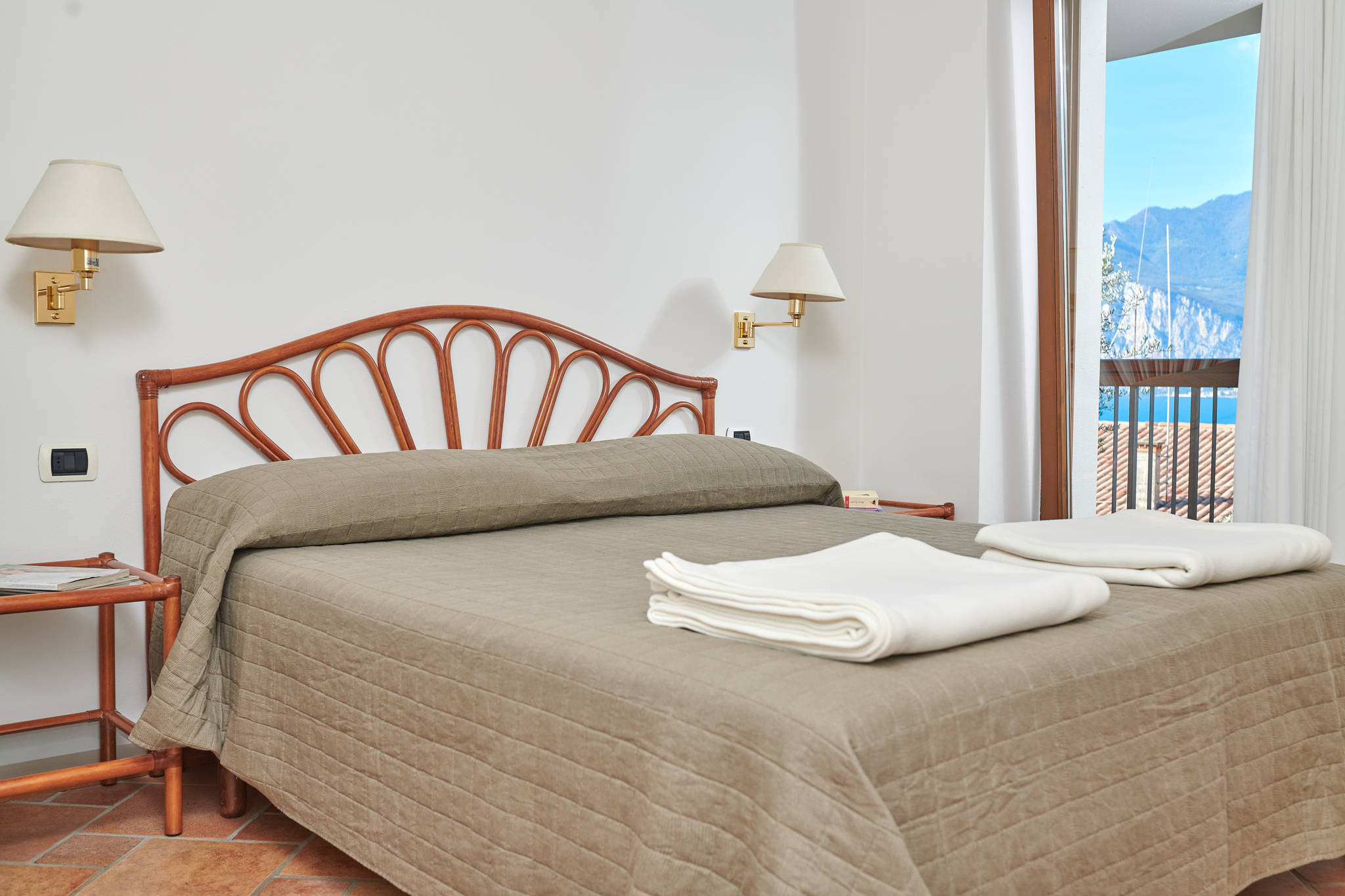 La struttura offre, a seconda delle esigenze, monolocali o bilocali: ogni appartamento dispone di balcone o terrazza vista lago, talvolta anche con accesso diretto al giardino. In circa 10 minuti si arriva comodamente a piedi nel centro della cittadina o sulla spiaggia.